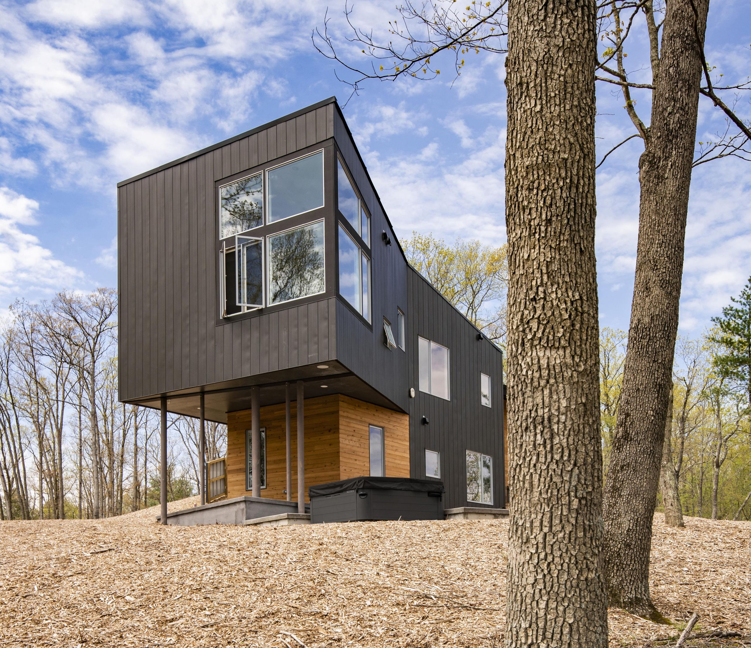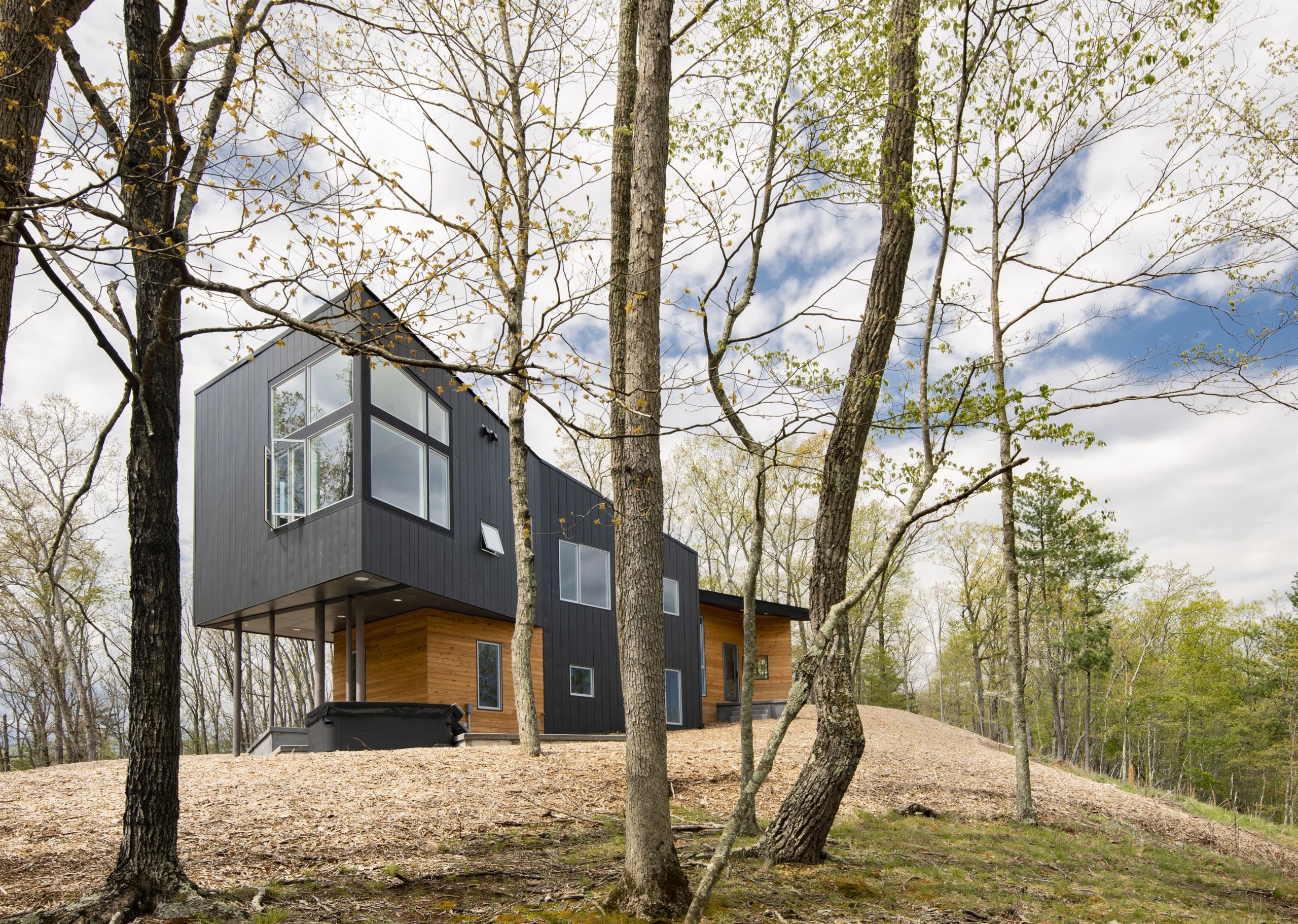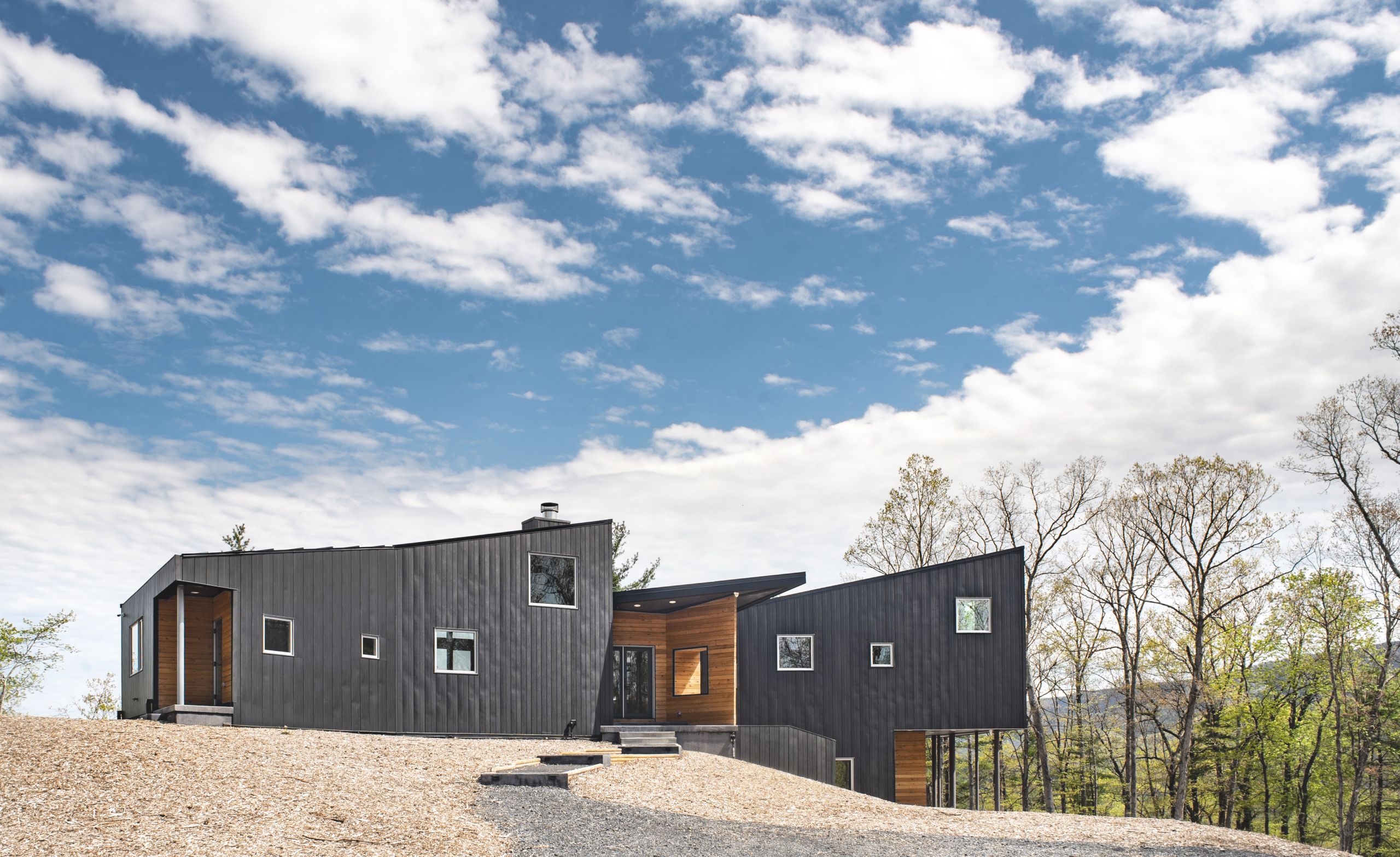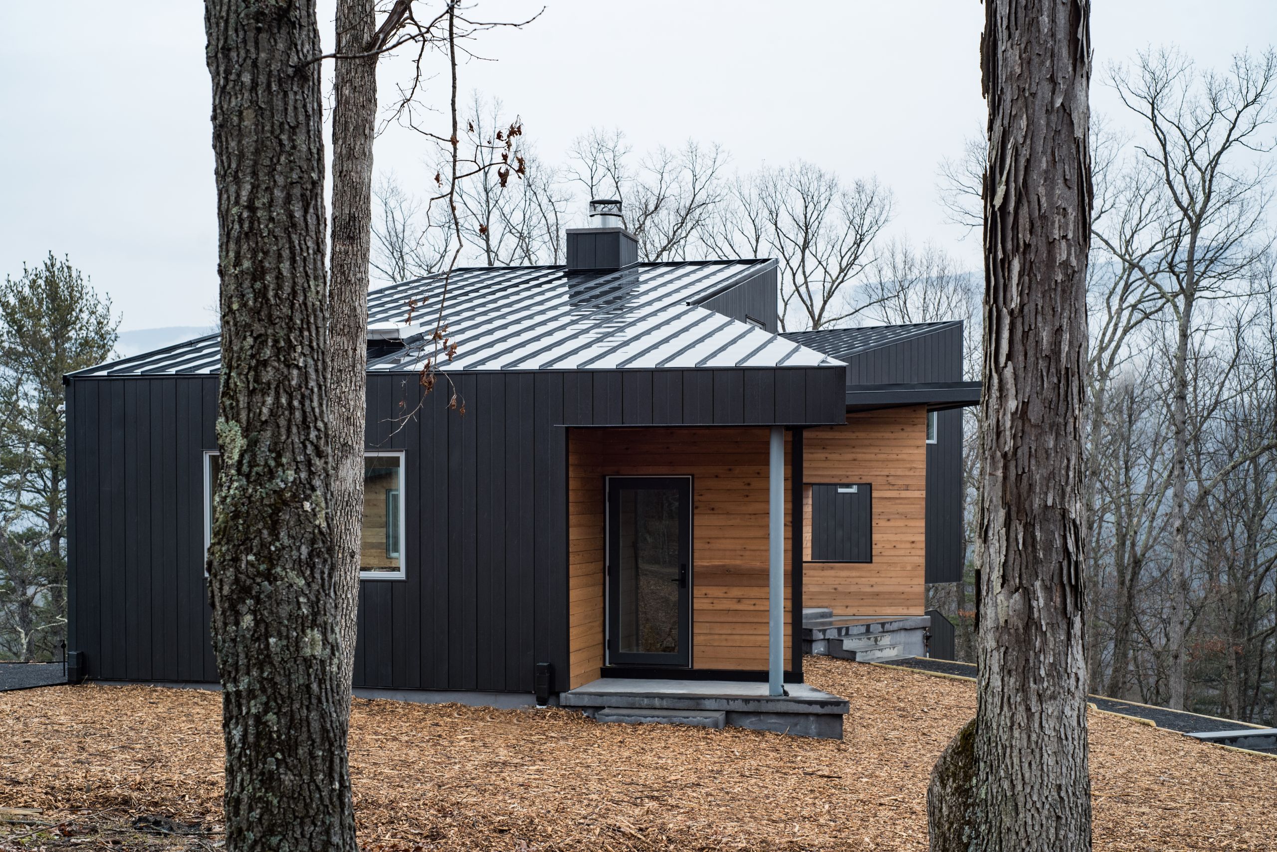This weekend house is perched on a sloped site at the top of a scenic ridge line. It overlooks the Great Cacapon River Valley near Berkeley, West Virginia. The facade is clad in a striking contrast of cedar and black vertical metal siding, both emphasizing the unique arrangement of angular forms and anchoring the house within the surrounding woods. A few small windows sparsely puncture the entry side while the opposite side opens up to dramatic views of the landscape with large windows. A large cantilever on the end of the master wing extends towards the trees, invoking a treehouse-like feel inside the primary bedroom. Wood finishes, raw steel, and a muted color palette throughout the modern interior help to further highlight the impressive exterior scenery.
