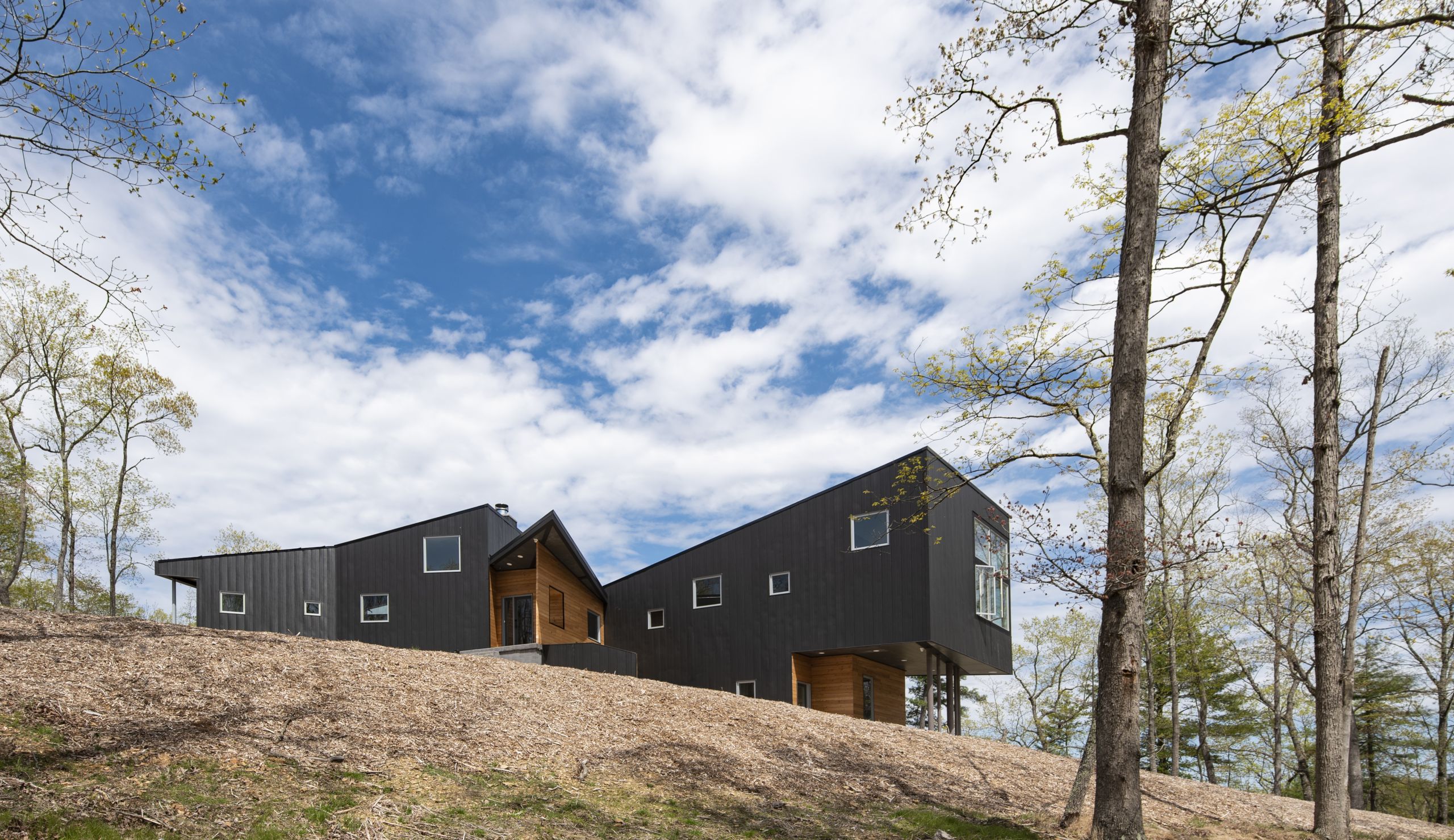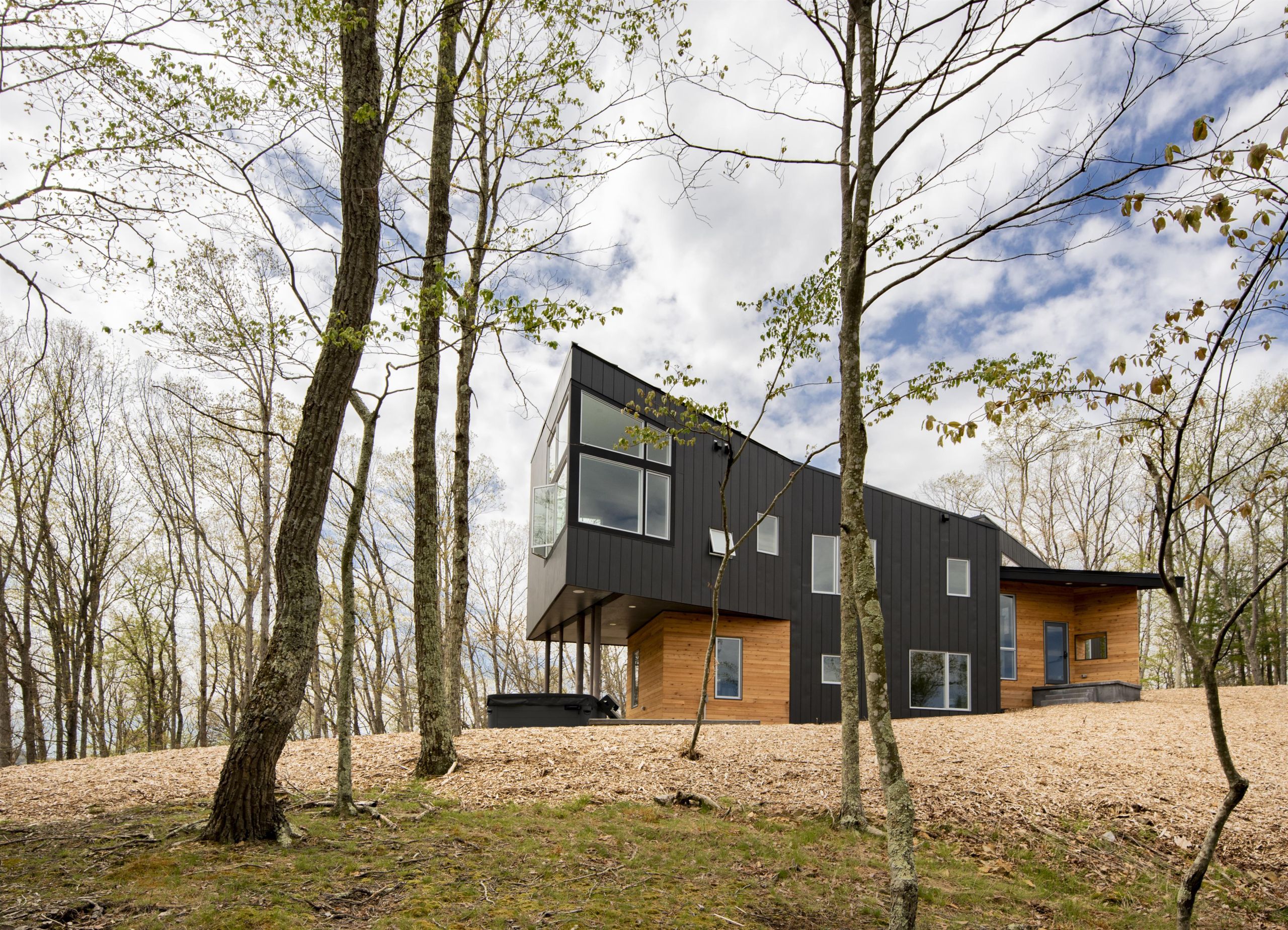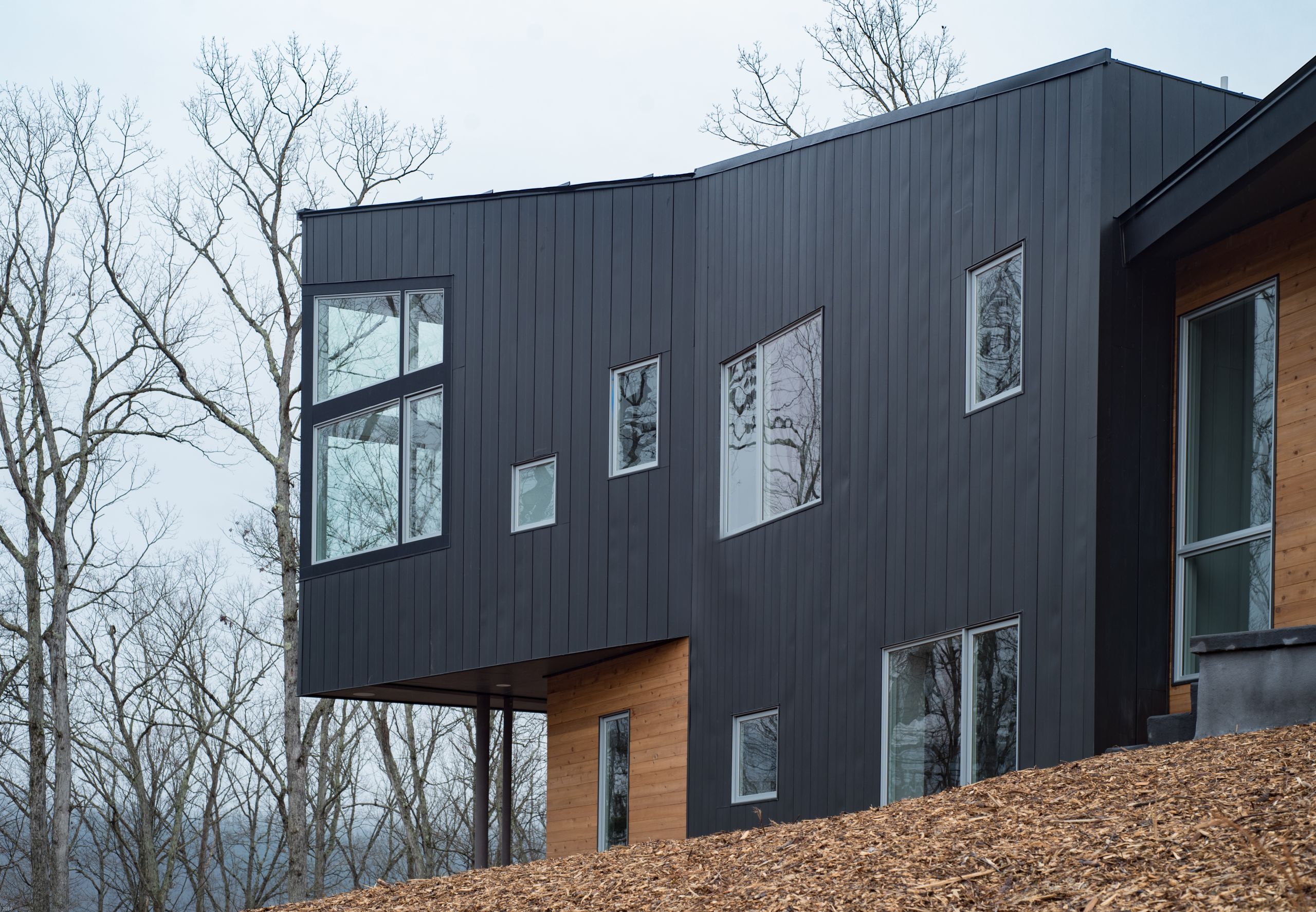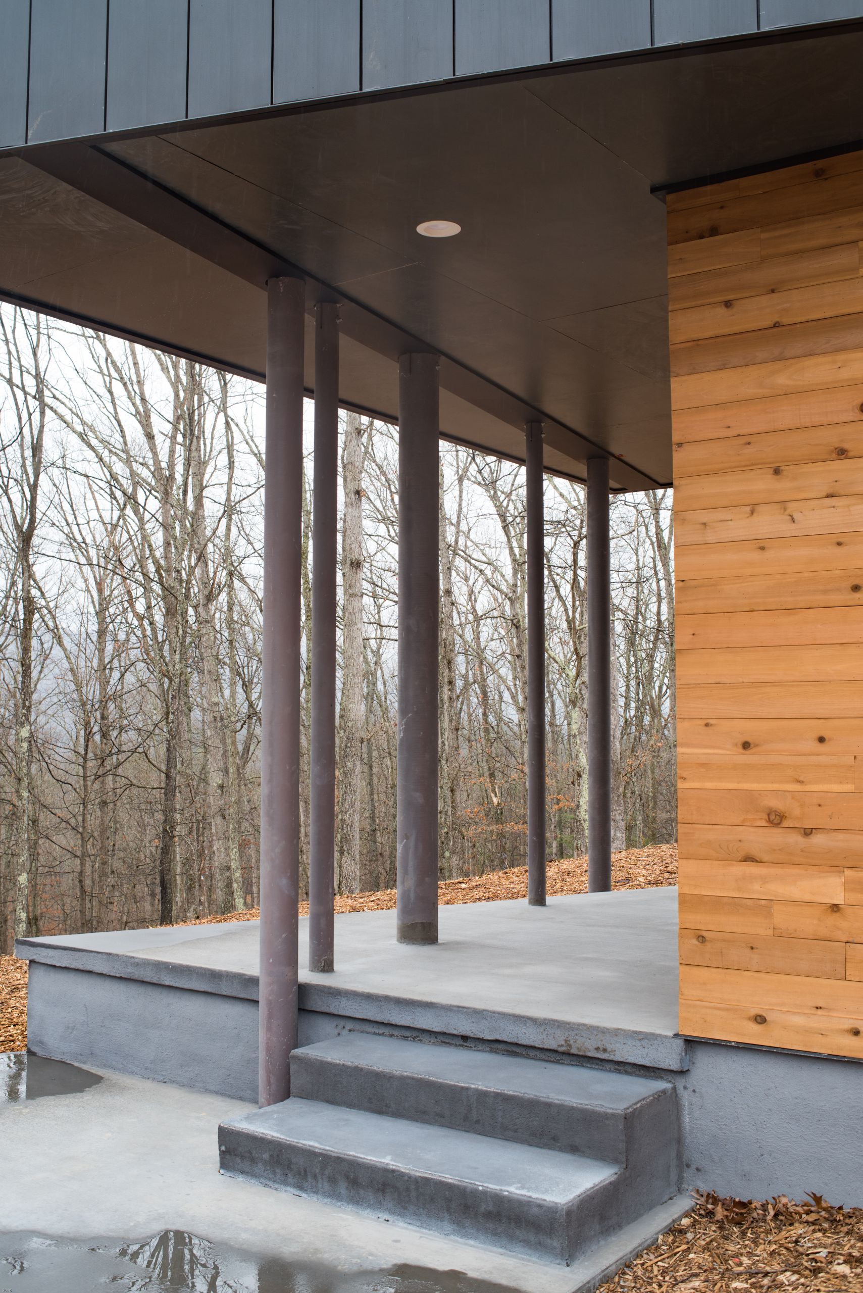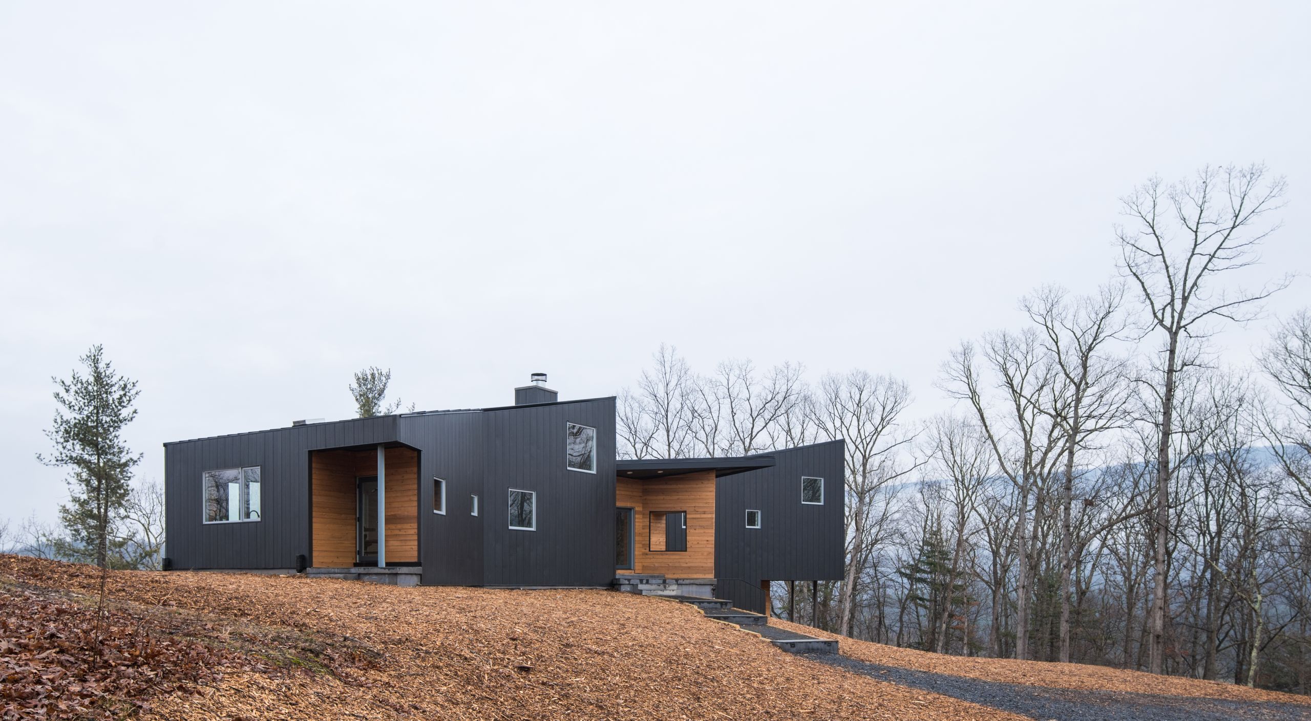 This weekend house is perched on a sloped site at the top of a scenic ridge line. It overlooks the Great Cacapon River Valley near Berkeley, West Virginia. The facade is clad in a striking contrast of cedar and black vertical metal siding, both emphasizing the unique arrangement of angular forms and anchoring the house within the surrounding woods. A few small windows sparsely puncture the entry side while the opposite side opens up to dramatic views of the landscape with large windows. A large cantilever on the end of the master wing extends towards the trees, invoking a treehouse-like feel inside the primary bedroom. Wood finishes, raw steel, and a muted color palette throughout the modern interior help to further highlight the impressive exterior scenery.