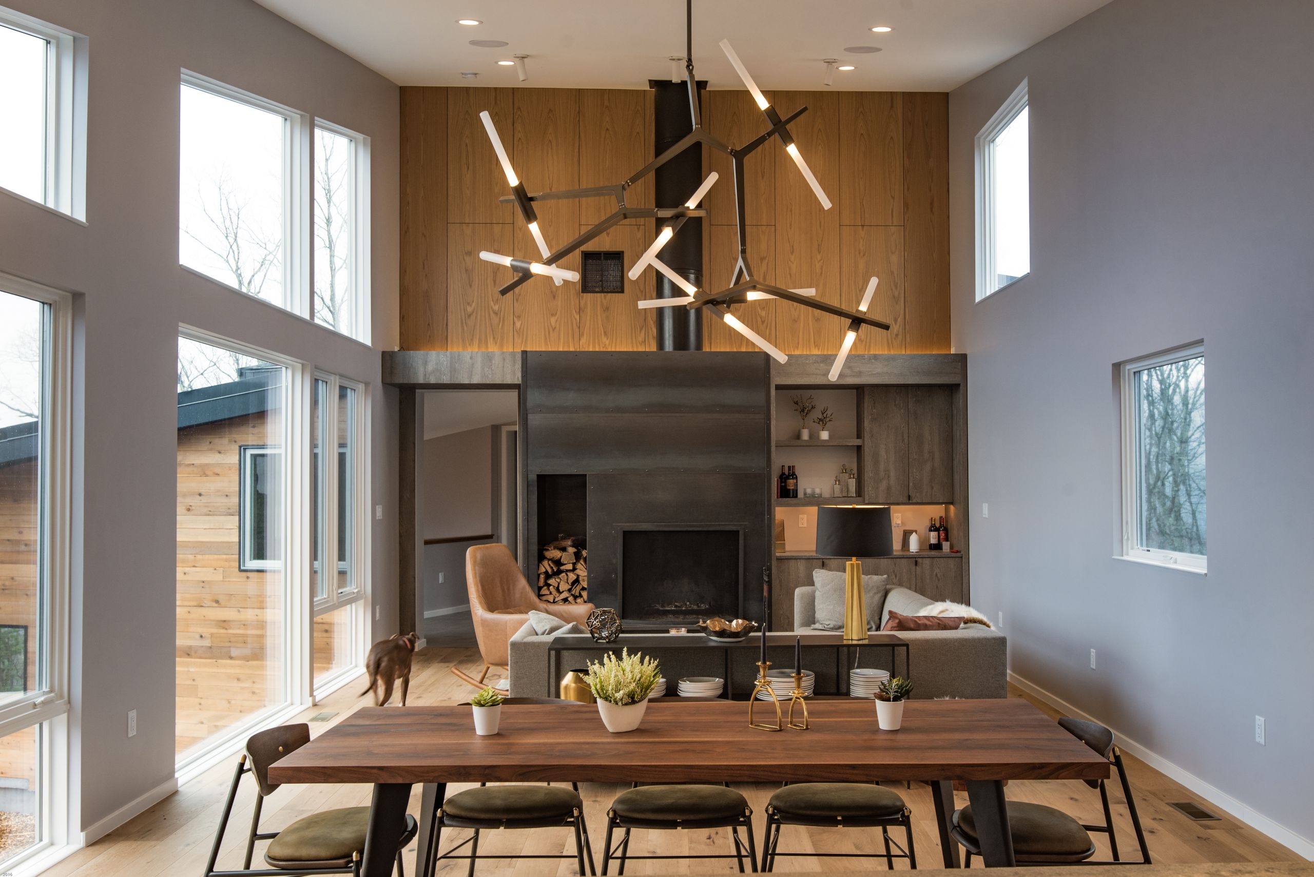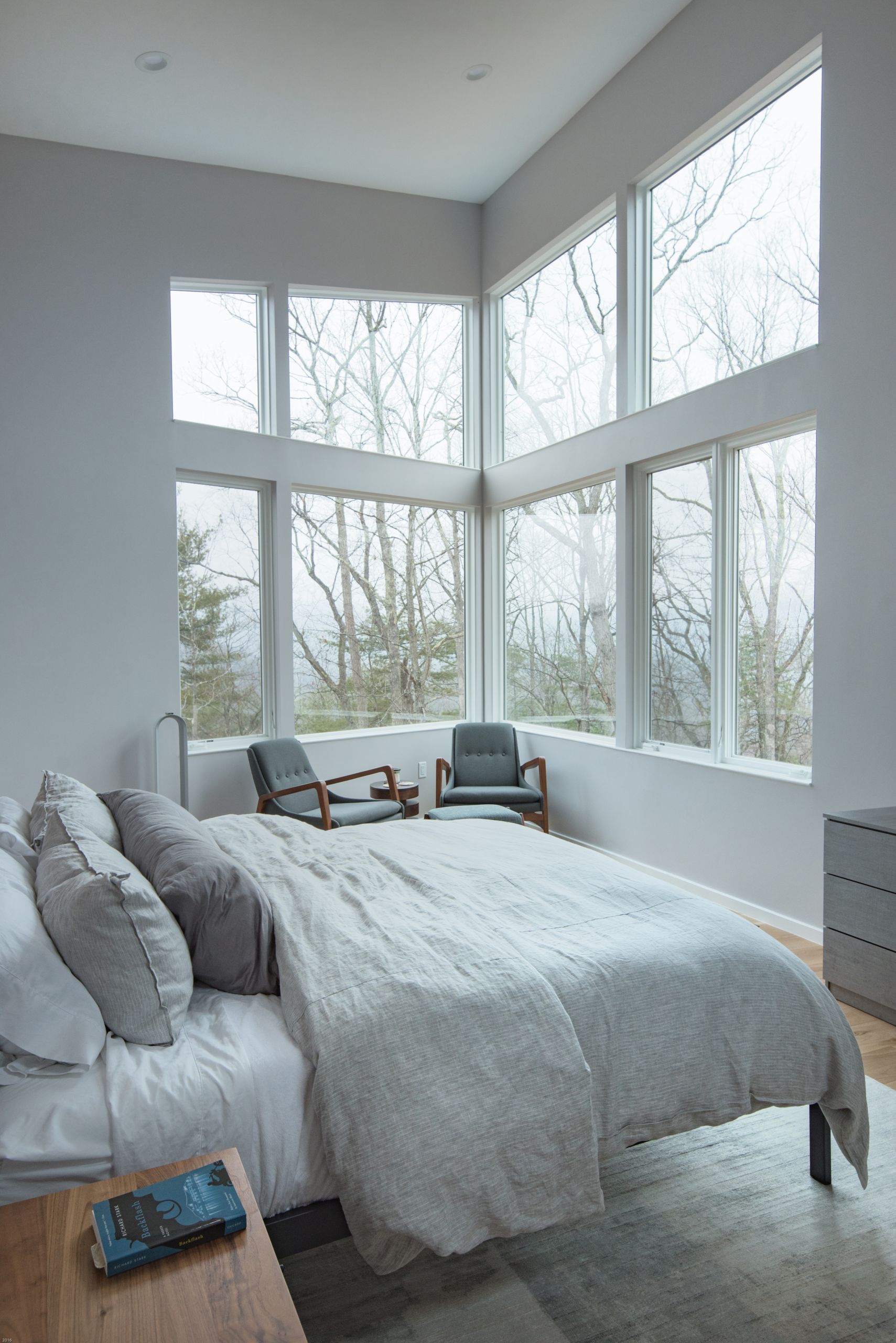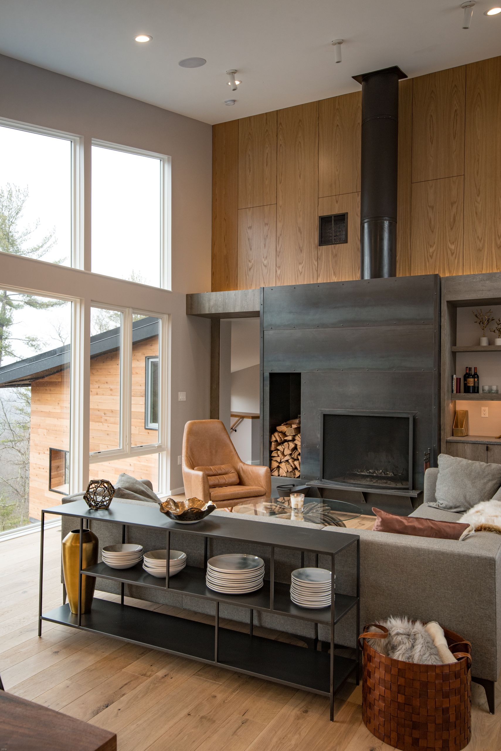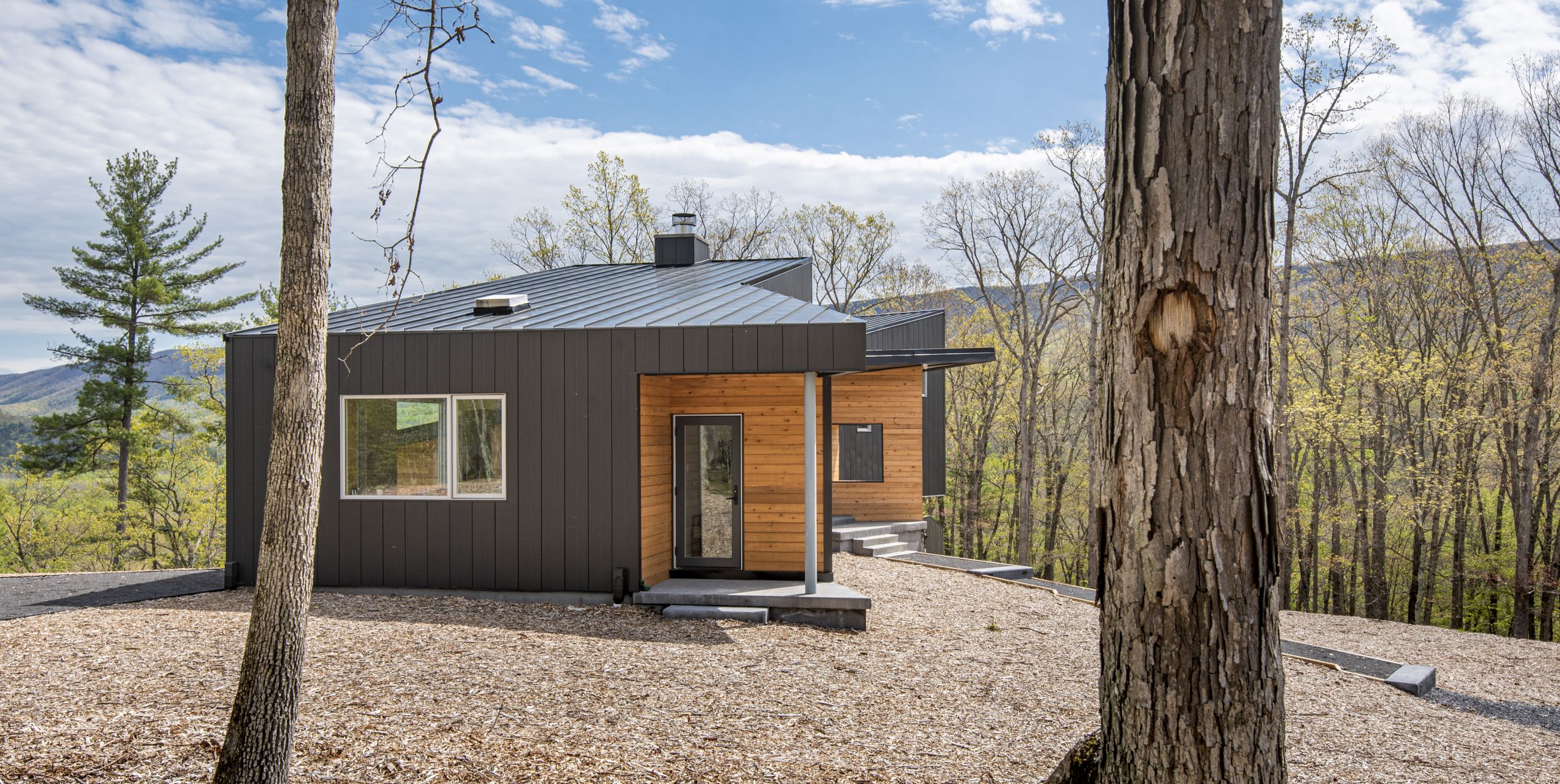 This weekend house is perched on a sloped site at the top of a scenic ridge line. It overlooks the Great Cacapon River Valley near Berkeley, West Virginia. The facade is clad in a striking contrast of cedar and black vertical metal siding, both emphasizing the unique arrangement of angular forms and anchoring the house within the surrounding woods. A few small windows sparsely puncture the entry side while the opposite side opens up to dramatic views of the landscape with large windows. A large cantilever on the end of the master wing extends towards the trees, invoking a treehouse-like feel inside the primary bedroom. Wood finishes, raw steel, and a muted color palette throughout the modern interior help to further highlight the impressive exterior scenery.