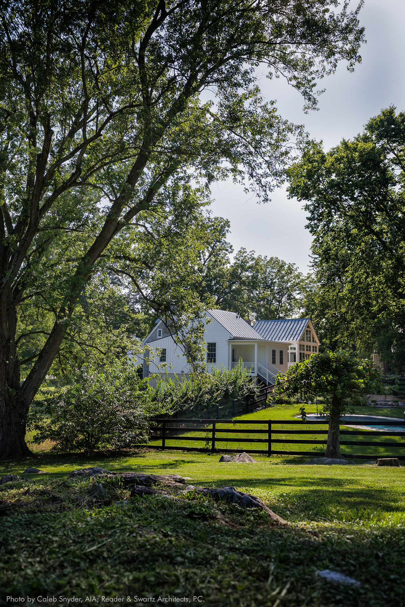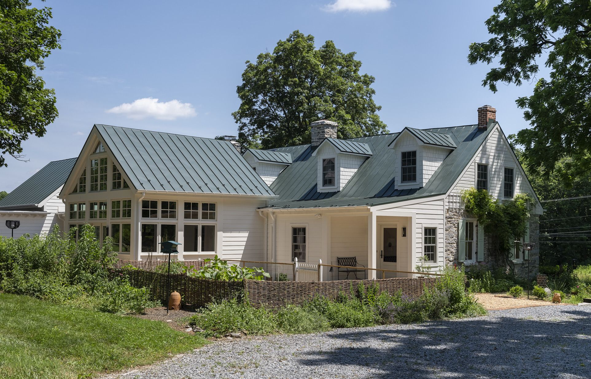 The design involved removing the old back and side additions. The former kitchen became a new side entry mudroom into the house. A new office and primary bath were added along a new longitudinal circulation spine that also serves the original rooms of the house. A new kitchen, with a large table in the center, was added to the rear of the house. The kitchen was designed in the spirit of a greenhouse, with windows on three sides, and an open gable ceiling with high transoms. The kitchen has views of the farm and a connection to the adjacent vegetable and herb gardens. A new primary bedroom was added to the eastern end of the house, in the form of a gable with a catslide roof, which mimics the original roof massing. The additions were placed in the same areas as the demolished portions, avoiding the roofline and dormers of the old house. The exterior materials used were meant to complement the historic structure without blurring the old and new. These materials include standing seam metal roofs, lap siding, and pressed metal panels.